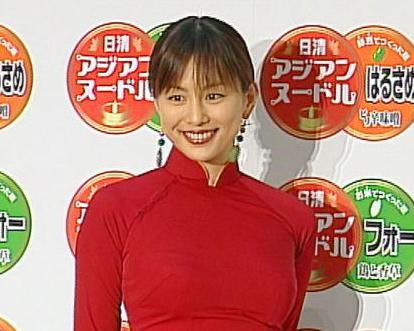 日清アジアンヌードルのCMに出演していた女優の米倉涼子さんが着用している赤リップにボルドーっぽい赤のアオザイ。