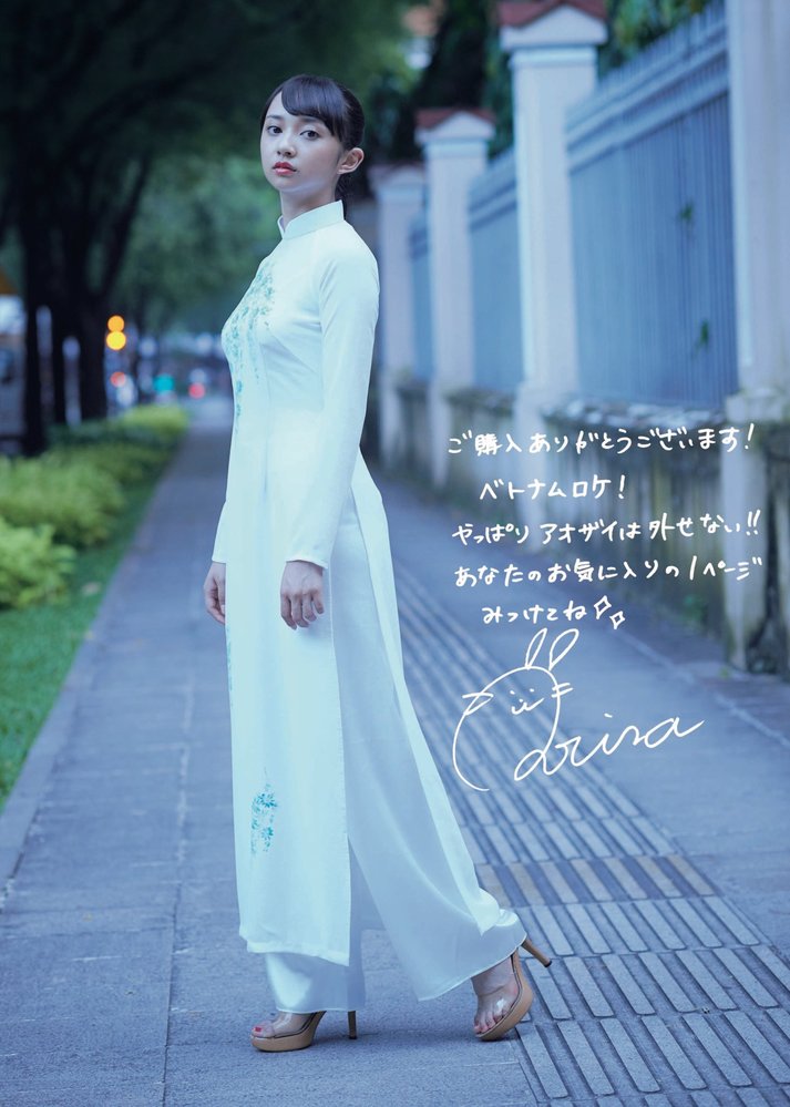 上下白のベトナムの女学生が着るようなアオザイを着用。スタイルがより際立ち露出はないものの色気も漂っていますね。完璧に着こなしに脱帽です。