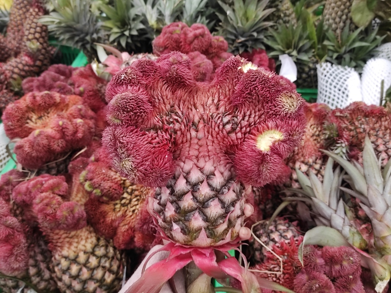 形は、通常のパイナップルの実の上にある緑の冠がとさかのようになっているバージョンから、実の根元の部分に多方向に向かって小さなパイナップルの実がなっているバージョン、さらにこの二つのハイブリッド型もあるなど、実に多様な形をしています。