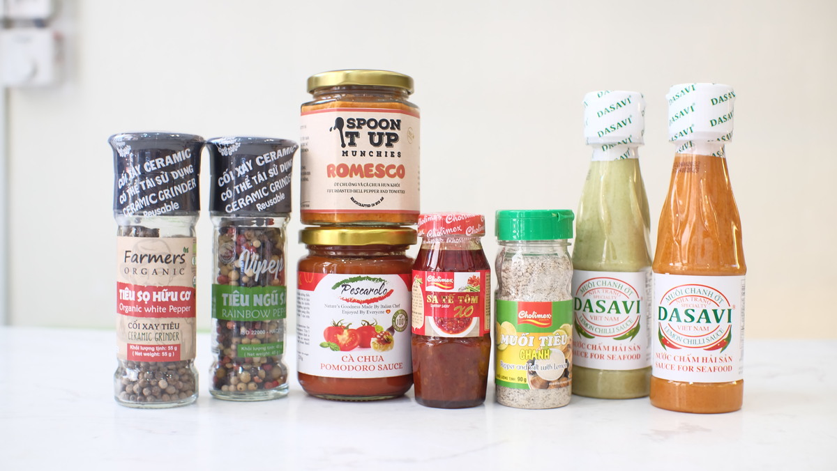 左から:フーコック産の胡椒、ベトナム産の本格パスタソース、サテトム、レモン塩、チリソース
