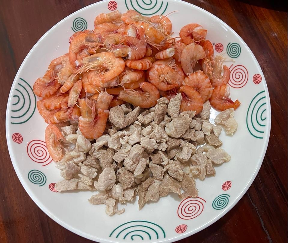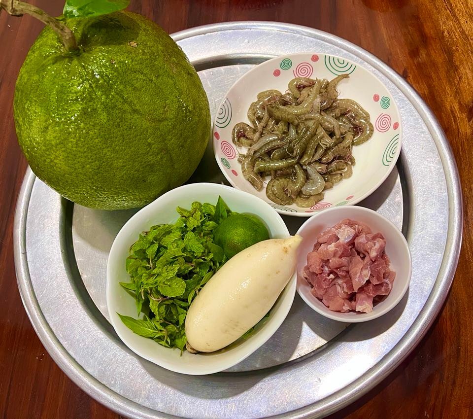 | ーザボン :1/2玉 ー生海老 :200g ー豚バラ肉 :200g ー大根 :1/2本ー乾燥紫玉ねぎ :100g ーにんじん: 1/2本 ー玉ねぎ :1/2個 ーパクチー 好きな量 ※banh phong tom(:エビセン)はお好みで | ー唐辛子:1本 ー胡椒:少々 ーにんにく:好きな量 ーレモン:1/2個 ー砂糖:300 grー酢:大さじ2杯 ーヌックマム:大さじ2杯 |