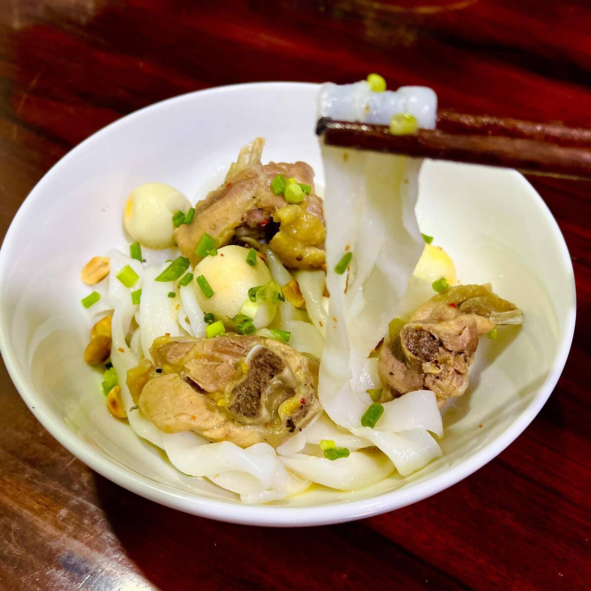 味が濃いめで少なめの汁に米粉の麺とトッピングの鶏肉や海老、魚、うずら卵などがたっぷり入ったローカルフードの一品です。