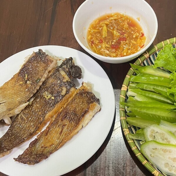 ダナンの地元料理のエイの揚げ物「Cá đuối chiên nước mắm」
