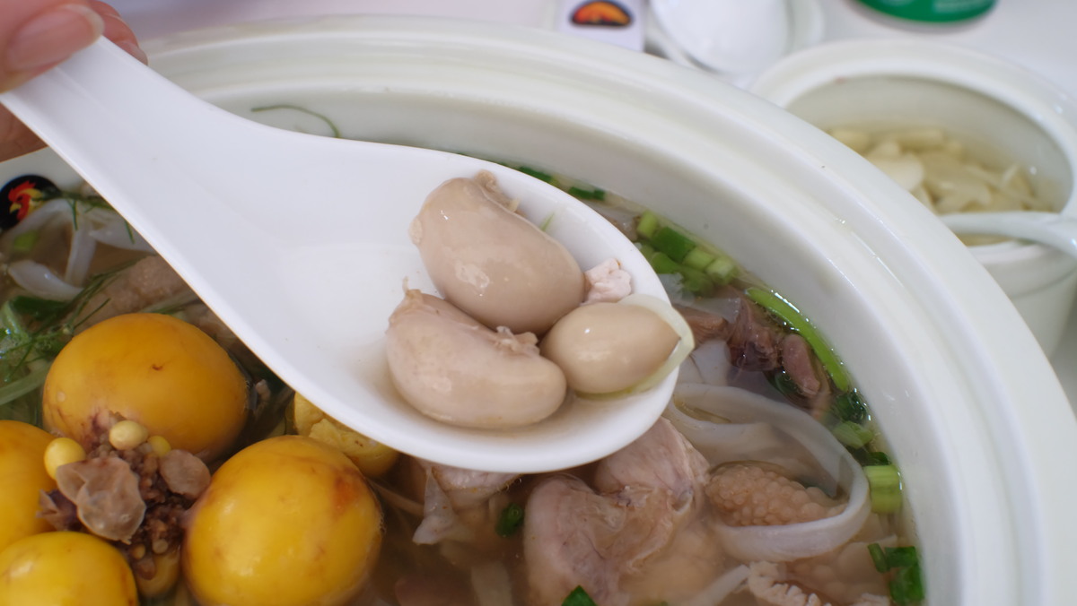 トッピングには、鶏のキンカン、鶏手、もも肉、ハツ、レバー、睾丸、その他鶏皮の部分が入っています。