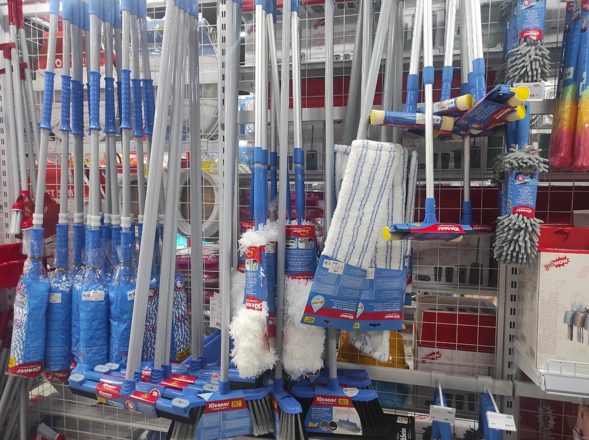 洗剤(重曹・セスキ炭酸ソーダ・パイプハイターなど)、虫ケア用品(アリの巣ころり・コバエホイホイ)、モップ、窓拭きワイパー、ほうき、コロコロ(粘着テープのゴミ取り)、