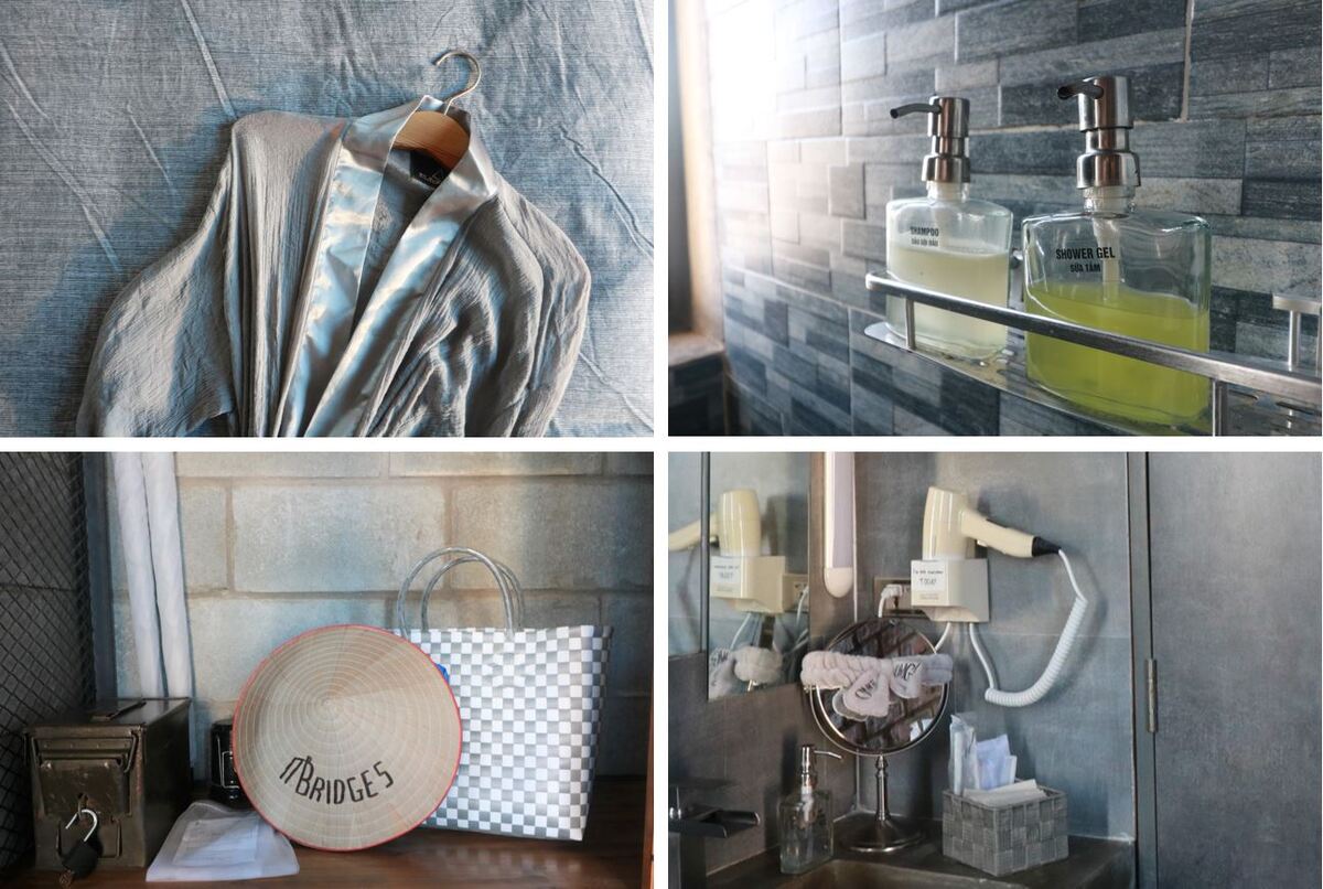 バスルームには、アメニティは歯ブラシやコットンなどのアメニティーが完備。バスローブはシルク素材です。