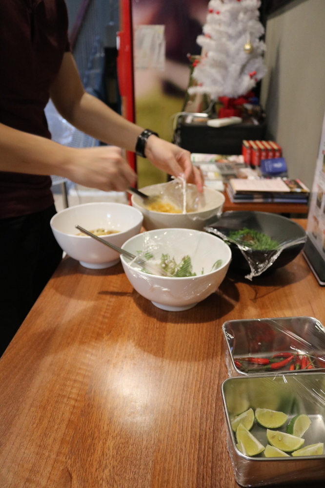ベトナムでは席についてから注文、食べ終わってからテーブルでお会計を済ますのが一般的。こちらのお店では、日本のうどんチェーン店のような仕組みを導入しています。