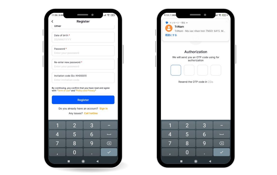 アプリはベトナム語と英語に対応しており、すぐに会員登録画面が出てきます。