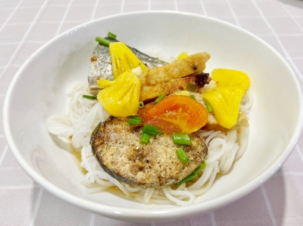 - つけ麺をどんぶりに入れ、うえにマグロスープをかけ、出来上がりです。(つけ麺は市場で簡単に購入できますが、代わりにスーパーで売っている乾麺(Bún khô)を使用してもOKです。)