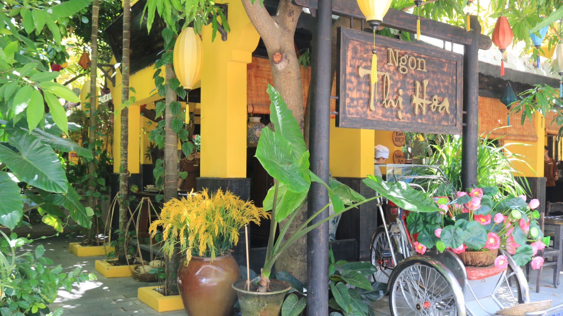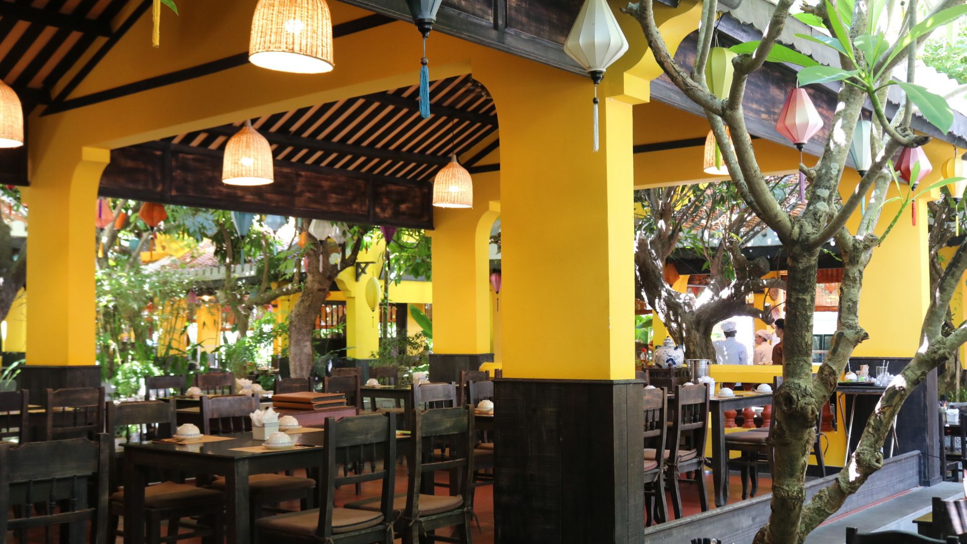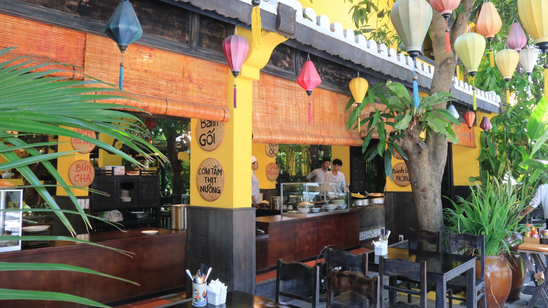 黄色をベースとしたホイアンの雰囲気を持ち、店内は屋根のあるオープンスペースとエアコンの効いたお部屋の2パターン。