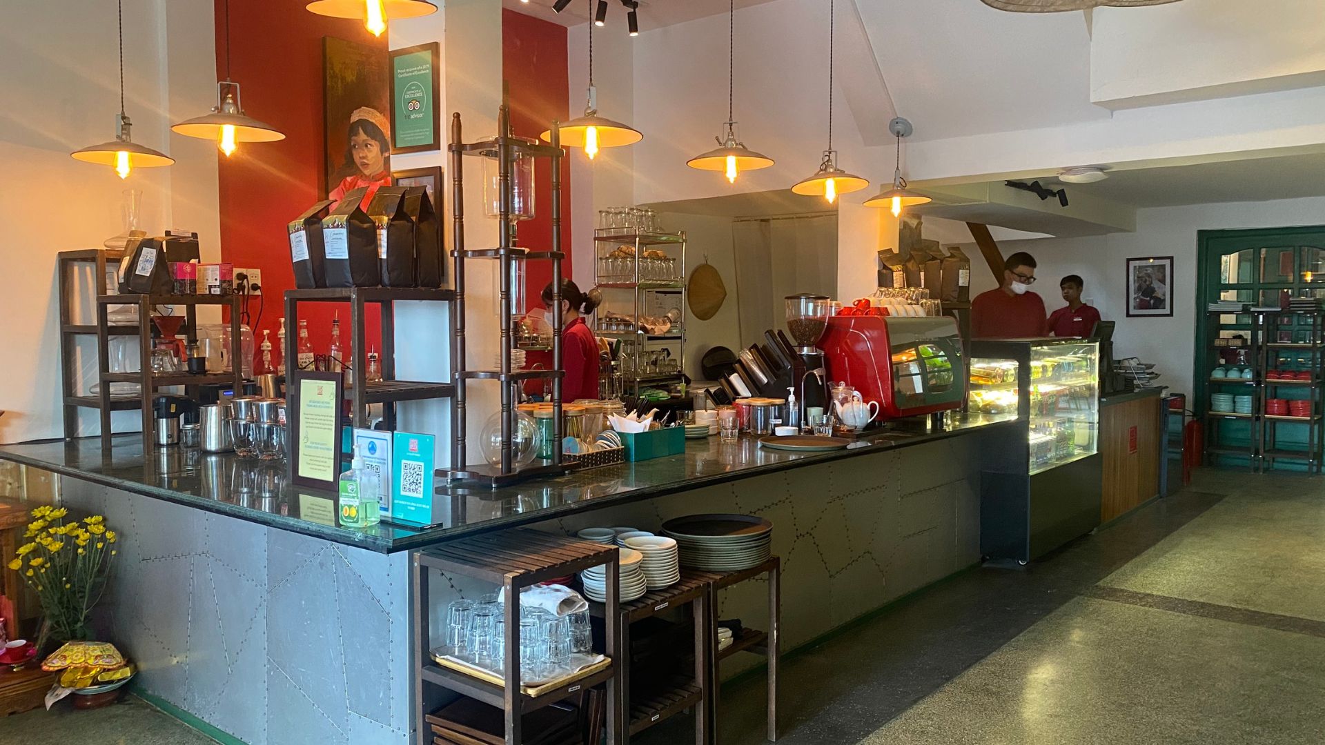 ホイアンの雰囲気を感じる黄色の外観、店内は温かみのある空間です。