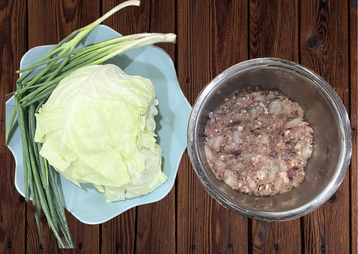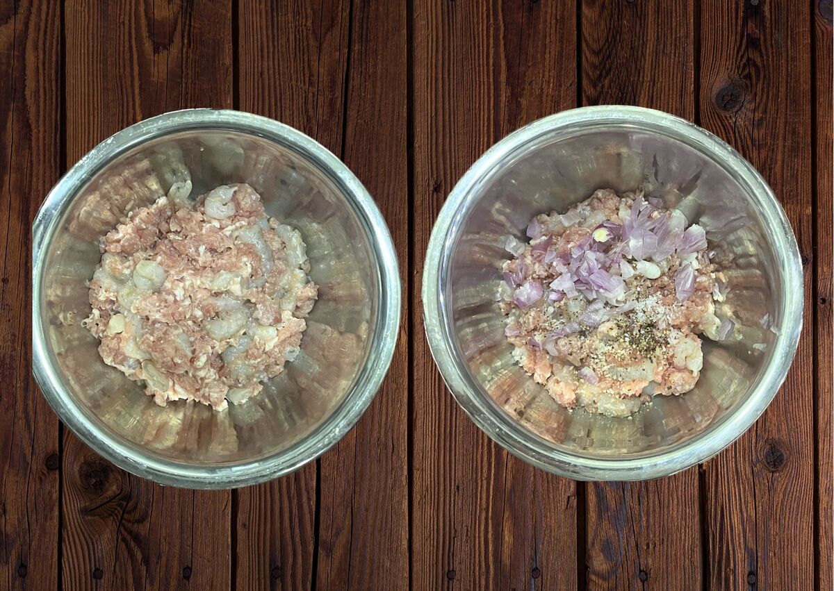 - 肉ダネを作る 豚ひき肉100gに海老100g、油(大さじ1)、コショウ(小さじ1)、塩(小さじ1)、みじん切りの紫玉ねぎ(少々)を加えて、手でしっかりとこねます。