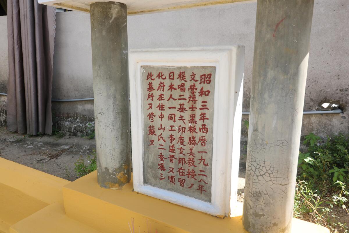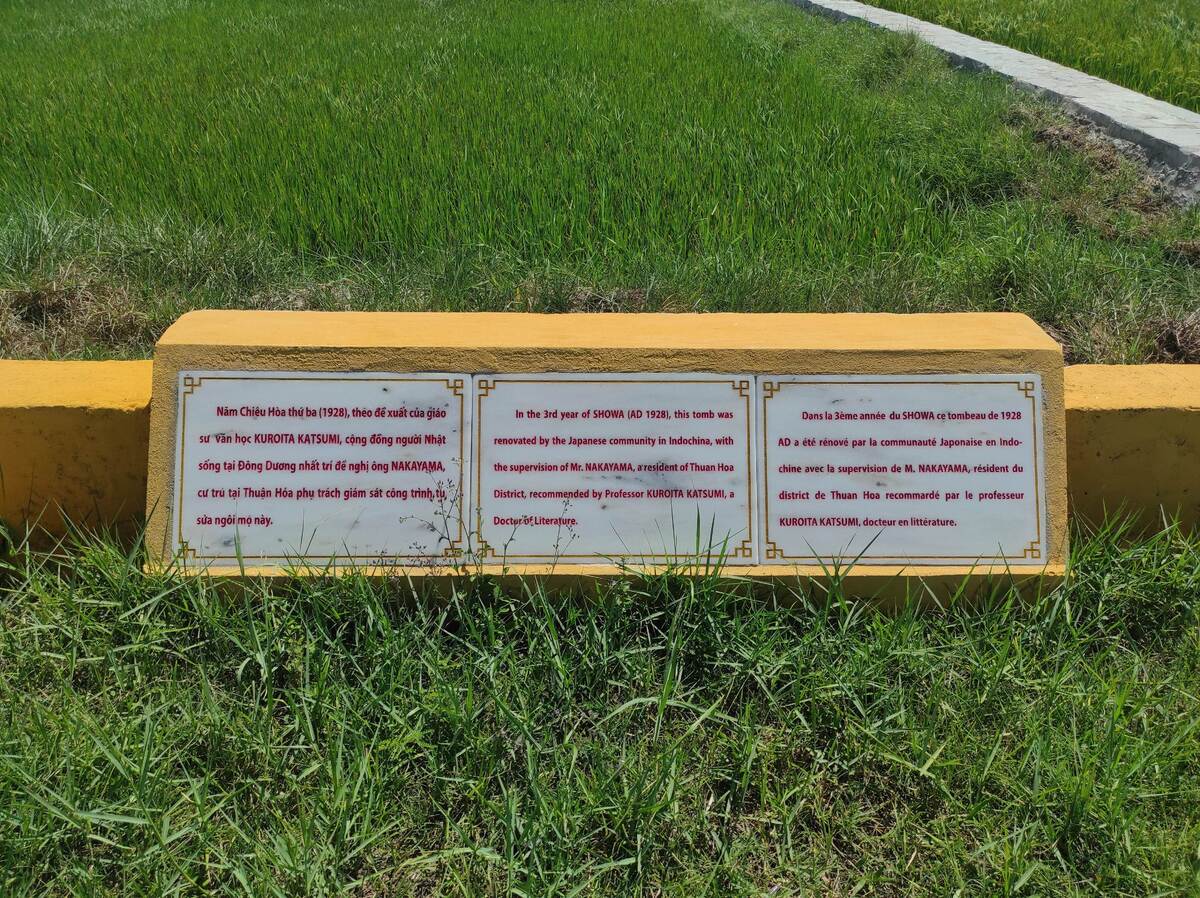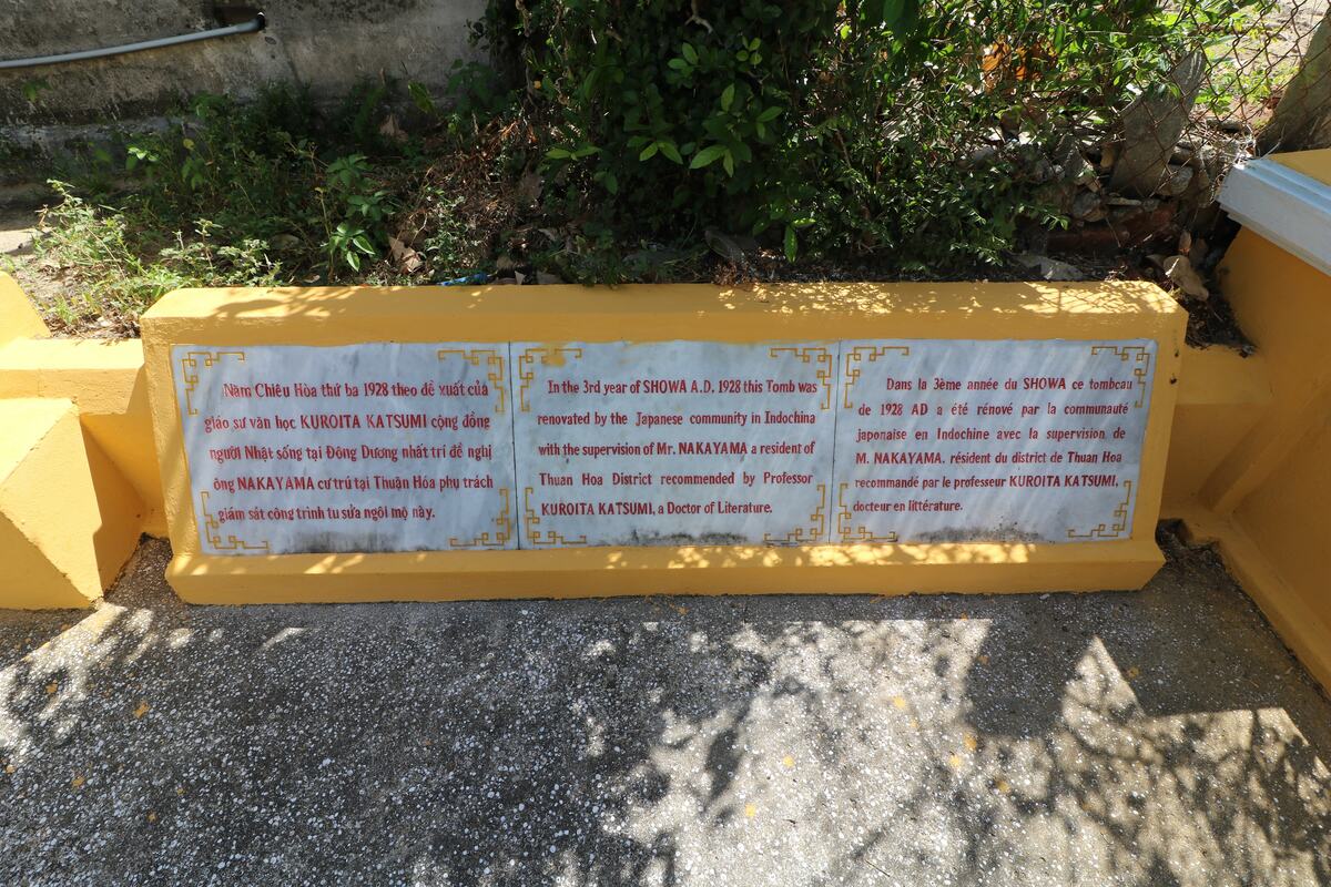 「昭和3年西暦1928年文学博士黒板勝美教授の提唱に基きインドシナ在留日本人一同工事監修また順化府(現在のフエ省)在住中山氏に委嘱しこの墓所また修築す」