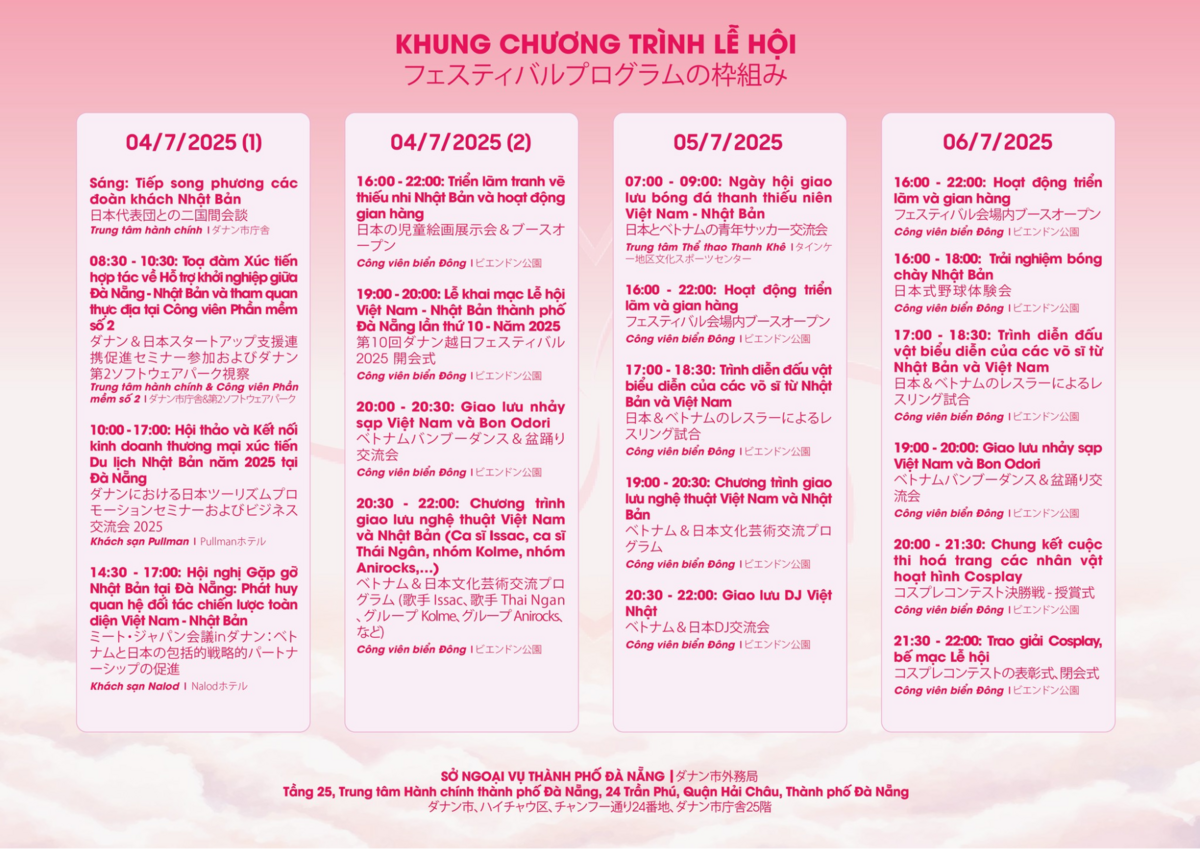 参考: SỞ NGOẠI VỤ THÀNH PHỐ ĐÀ NẴNG「Lễ hội Việt Nam - Nhật Bản thành phố Đà Nẵng 2025: Từ hành trình 10 năm kết nối văn hóa đến phát huy quan hệ đối tác chiến lược toàn diện Việt Nam – Nhật Bản trong kỷ nguyên mới」、 在ダナン日本領事館「https://www.danang.vn.emb-japan.go.jp/itpr_ja/11_000001_00707.html」