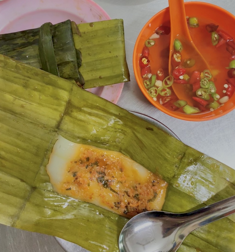 生地の方にもエビや豚のエキスがしみ込んでいて、バナナの葉に包んで蒸しあげたことにより優しい味わいに仕上がっているのも特徴です。