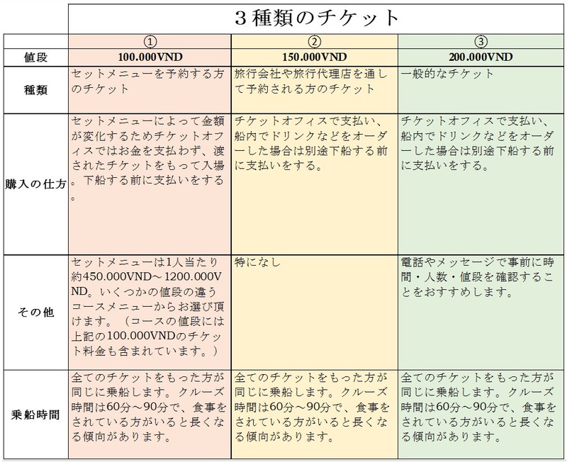 他のクルーズ船ではベトナム伝統芸能を見れる船もあるので、用途に合わせてお選びいただくと良いと思います。