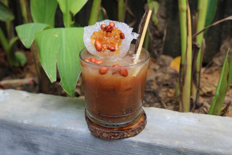煎ったピーナッツをミキサーにかけ、汁だけをパイナップル葉っぱ、練乳や砂糖と一緒に煮ます。