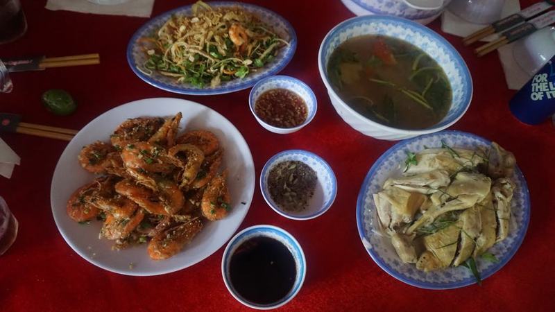 エビ、鶏肉、豚肉、野菜、お米などの料理があります。