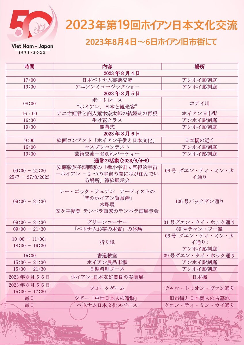 イベント内容は例年に引き続き、ボートレース、Ngoc Hoa王女と日本人商人荒木宗太郎の結婚式の再現ショー、日本のアニメのコスプレコンテスト、絵の展示会、書道披露等日本とベトナムの繋がりを感じるイベントが多数実施される予定。